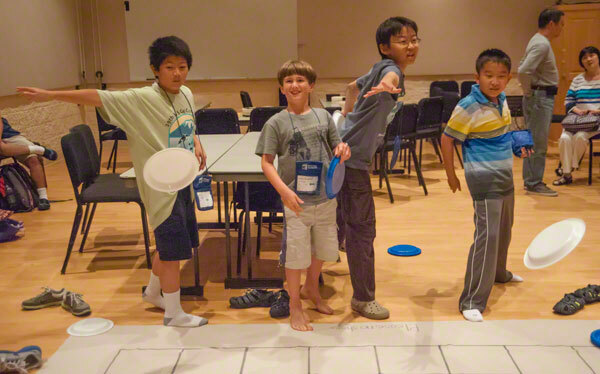 Today's tournaments in the Youth Room at the US Go Congress included 9x9 and 13x13 tournaments, run by Fritz Balwit, and a little impromptu frisbee go on the ten foot by ten foot 9x9 board as well. Table winners in the 9x9 were: Willis Huang 3d, Job Betcher 2d, Julie Burrall 4k, Bryan Tan 8k, and Bob Liu 13k; 13x13 table winners were Justin Ching 4d, Daniel Puzan 1k, and Eric Liu 5k. -Paul Barchilon, E-J Youth Editor; photo by Phil Straus