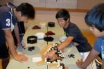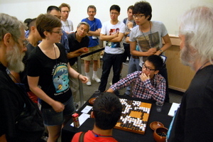 Tuesday. The games on both top boards -- both being broadcast live on KGS and drawing a crowd in the playing room as well -- were half-pointers, and TD Karoline Burrall and other officials were called in to help adjudicate the scoring in the Board 1 game between the undefeated Zi Yang (Matthew) Hu 1P and Yuhan Zhang 7d because of a question about how to count points in seki. Zhang got the win, snapping an impressive winning streak in the U.S. Open by Hu that goes back to 2011. Hu was back in form in his Masters tournament Round 3 game Tuesday night, handily defeating Jie Liang, while Stephanie Yin dispatched Hugh Zhang and Andy Liu 1P notched his second 2013 NAMT win by defeating Justin Teng. In the Strong Player's Open, Cong Li continued his run by beating Ho Son, as did Yuhan Zhang, winning against Juyong Koh, and Beomgeun Cho, defeating Andrew Huang. Latest results — and game records — are here: