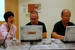 photo: Lin (left) and Yang (right) with EJ Managing Editor Chris Garlock; photo by Todd Heidenreich