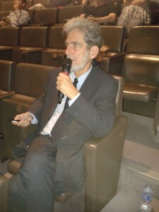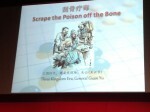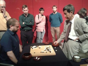 After a short break, the house reassembled less formally for actual play, with Wang playing simultaneously with four volunteer players from the BGA. On board one was Matthew Cocke 5d of Epsom Go Club (above right, 2nd from top), one of the UK's strongest players, who was given a 3-stone handicap. This game was televised on a large screen, with Francis Roads giving a running commentary over the PA with the help of a laser pointer (right). Cocke was visibly shaken when, towards the end of the middle game, he realized he had allowed four stones to be cut off, an oversight which quite possibly cost him the game. Out of courtesy to the British who, like other Westerners, have the Japanese traditions deeply imbued, territory scoring was used rather than the Chinese tradition of area scoring. Cocke lost by 4 points. At the next board was was British Under-10 Champion Oscar Selby 8k, who took nine stones and lost by six points, earning praise from Wang. Next was engineer Mark Baoliang Zhang 1k of Diss (no club) who took seven stones and was behind when the game had to be halted because the museum was closing. Michael Webster 2d of the Central London Go Club, taking six stones, had perhaps the best result of the four, with Wang conceding that Webster had the lead at the point play stopped in this also unfinished game.