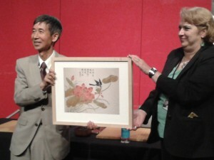 - report/photos by Tony Collman, British correspondent for the EJ. Top right: Lisa Quastella of the British Museums's Sales and Marketing Dept presenting Wang with the gift of "Lotus Flower Print" by Ding Liangxian; group photo: (seated, l-r) Wang Ren, Francis Roads, Dr Chan Cheng, Wang Runan, Sherry Kuei, Chen Yongqing, Chen Jiuxuan. Translations were provided by Wang Ren, friend of the UKCTC (Wang, Dr Chan) and Yuki Kuan of the EMYCO (Kuei, Chen, Roads), who also provided extensive assistance with the compilation of this report. NOTE: the original report has been updated to reflect that Wang Runan is President of the Chinese Weiqi Association, not Vice Chairman, as originally reported.
