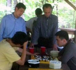 - report/ photo by Charles Alden; photo: photo, tournament winner Liqun Liu (seated, right) faces Jeff Kuang in the third round as Eric Zhang and Frank Salantrie observe.