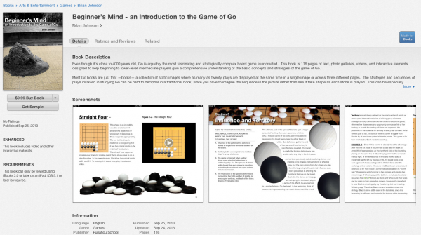eBook. Johnson is a teacher at Punahou School who teaches a credit high school go course called "Buddhism and the Game of Go" and introduces around 150-200 students each year to the game. The ebook's text is designed to take advantage of the touchscreen features of the iPad and contains numerous picture galleries, animations, and interactive elements to help explain and clarify basic and more advanced concepts of go strategy. Only available for the iPad, it's $9.99 in the iTunes Store, where you can download a free sample.