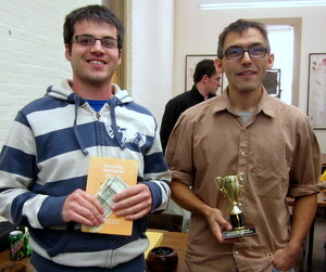 Ten players showed for the Louisville Go Club's first annual tournament on October 19 in Louisville, KY, including some players from the Cincinnati Go Club. An undefeated Chris Martin 4k (3-0, on right) took first place with Taylor Perkinson 6k (2-1 on left) in second. - report by Asha Nagaiya