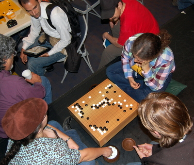 photo collage: top right: Haijin Lee 3p reviews a player's game; bottom right: spectators gather around one of the top boards; bottom left: two masseuses -- one of the Cotsen's unique features -- work their way through the field; top left: longtime go author Richard Bozulich (at left, talking to AGA President Andy Okun) dropped by for a brief visit Saturday morning while in town from Japan on a business trip. photo at left: Cotsen staff play a casual game.Report, photos & collage by Chris Garlock
