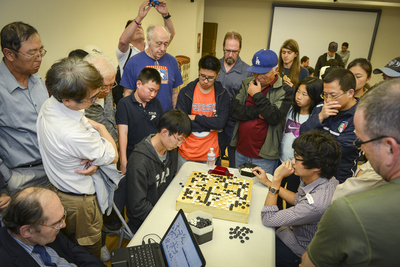 photos: at right: Cho (center) with tournament sponsor Eric Cotsen (right) and AGA President Andy Okun; at left: the round 5 game. report by Chris Garlock; photos by