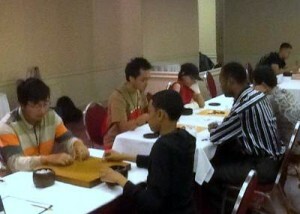 Pasadena's Yu Go Club -- with support from other area clubs -- participated in Pacific Media Expo's three-day expo in the LAX Hilton Hotel in Los Angeles last weekend. "People who had never seen the game were introduced to it, learned the rules and enjoyed playing against other beginners," reports Joe Walters. Yu Go Club members Ross Secrest, Greg Kulavich, Jiaying "Jerry" Shen, and Walters were assisted by Samantha Davis of the Santa Monica Go club and Jermelle MacCleod of the Woodland Hills Go club. The Yu Go Club is sponsored by Reiyukai America.