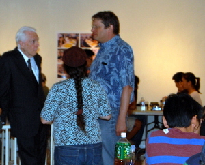 photo: Bozulich (at left), glimpsed at the recent Cotsen Open in Los Angeles, talking to AGA President Andy Okun; photo by Chris Garlock
