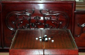 Bob Joyce. Schrag wondered "Is the position on the go board (at left) viable?" and Joyce says "I visited the garden on Saturday, September 28th and the position of the stones had changed (right); however, even a beginner (like me) knows that go games do not begin in the middle of the board."