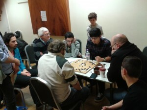 was present throughout, spending two-three hours per round reviewing games as well as giving a lecture on opening theory on Sunday 12/29 and one on local techniques Monday 12/30 and reviewing the top game on the teaching board on the Tuesday afternoon, 12/31. He told the E-Journal he had competed in the London Open in 2005 and was very happy to have been invited to teach there this year. Guo Juan, who has for many years filled this role, was in Montreal this year and so unable to attend. There was also a new event on Monday 12/30, the first WBaduk Varsity Match, between teams from Oxford and Cambridge Universities which was drawn