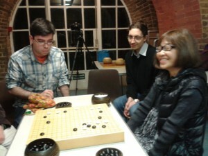 , starting off with the same two-moves-each against Kobayashi exercise as at N. London, as she commented with instructive criticism. They then solved a few tsumego together, after which three or four pairs of the attendees each played the first few moves of games which became the subject of the pro's comments. At the end of the evening - and the tour - Kobayashi was taken for a meal at the Favorit restaurant.