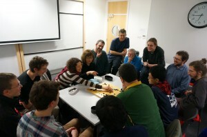 The next day, Kobayashi took the long train ride north to Edinburgh in Scotland, where she appeared on the evening of Thursday March 7 at the Appleton Tower of the University. Boris Mitrovic, a postgraduate research student at the University's School of Informatics and a challenger for the British Go Championship last year, hosted. There 15 sat around a single board