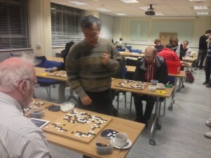 I caught up with her at the North London venue, where 11 attended, from beginner to 6d. Club Secretary Michael Webster was our host. Proceedings started with a similar exercise to that at Oxford, but with only about eight present initially, we formed one team to play by turn --two moves each -- against the pro while she made observations about our moves