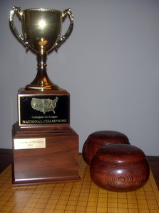 Pruitt. This Saturday, April 12 and the following week, April 19, the ACGA will host the 3rd annual Collegiate Go League championship on KGS. At 1 pm EST each Saturday in the KGS "Collegiate Go League" room, matches will be held between the ACGA's top four finishers from the season. The semifinals will be this Saturday, April 12, with Yale taking on top-seeded U. Mich and U. Toronto against U Maryland. The winners from these 5v5 school-based matches will face off in the finals on the next Saturday, for the coveted ACGA Cup (photo), with cash prizes for the top three winners. ACGA resident professional Stephanie Yin will be on hand each weekend to provide live commentary of the top boards on KGS, starting at 1:30 PM EST once the matches are underway. "We invite anyone to join the matches and kibitz away," says Pruitt, "especially students interested in promoting go in primary, secondary, and post-secondary school."