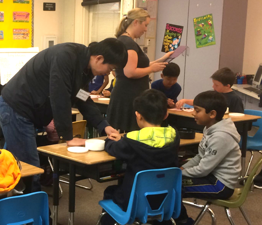"We just finished our 'Learn to Play Go' presentation at Sedgwick Elementary School, in Cupertino, CA, reports Wenguang Wang. "Yanping Zao and I presented go to four classes of third-graders in four 30-minute sessions (over 90 kids total). Since we have done this every year for Sedgewick's Annual Discovery Day, most of the kids in third grade or higher have been exposed to go. During the event, we talked about some fun facts of go, taught them the rules, and everybody played a few 9x9 games. Most kids loved the game and many were interested to visit our Santa Clara Youth Go Club to have more fun playing go," adds Wang. -Paul Barchilon, E-J Youth Editor. Photo by Yanping Zhao: Wang teaching students at Sedgwick Elementary.