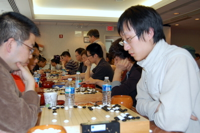 Andy Liu 1P (right) leads the first Washington Open Baduk Championship, 3-0 going into the final two rounds in Vienna, VA this weekend. Kevin Huang 7D is also 3-0 so the two are sure to meet on Sunday. Top-board games will be broadcast on KGS starting at 9:30a EST. Other top 2-game winners were Elaine Jiang 6D, Li Siyuan 7D, Zhaonian Chen 7D, Wu Changlong 7D (left in photo), Stephanie Yi and Kang Shin 7D. Click here for standings as of Round 3: Andy Liu 8d-Park In 2D and Liu Jian 2D-Stephen Webb 25k. See below for game records for Board 1 Rounds 1-3. 88 players turned out for the first day of play at the newest major AGA event, co-hosted by the Korean Amateur Baduk Association (KABA) and the American Go Association (AGA), and organized by the NOVA Go Club, the Baltimore Go Club, and the Korean-American Go Association. 2014.04.26_WOBC-Rd1-B1-Siyuan-Yin2014.04.26_WOBC-Rd2-B1-Changlong-Liu2014.04.26_WOBC-Rd3-B1-Liu-Chen - report/photo/game records by Chris Garlock