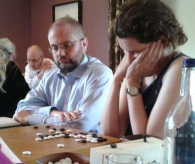 Natasha Regan and Matthew Cocke of Epsom (right) regained the title of British Pair Go Champions at the 24th British Pair Go Championship on Saturday May 17. They had lost it last year to Kirsty Healey and Matthew Macfadyen, but the 2013 Champions were unable to defend the title due to a prior diary fixture*. The clinching game of the three-round tournament was against Ingrid Jendrzejewski and Alex Selby and ended with both pairs having less than two minutes left of their allocated 45 before sudden death could decide it. Nevertheless Regan and Cocke won by a comfortable margin. A separate handicap competition was won by Jil Segerman and Pat Ridley, four pairs contending. Fighting Spirit prizes went to Edwina Lee and Charles Leedham-Green (main) and siblings Roella and Edmund Smith (handicap). The latter pair's sister Kelda and father Paul Smith won the quiz, and local pair Sam McCarthy and John Collins took the prize for Best-Dressed Pair. The prizes (below, left) were paired items of Japanese handicraft from the Japan Centre, the prize-winners being invited, in order, to make a selection from amongst those remaining.
