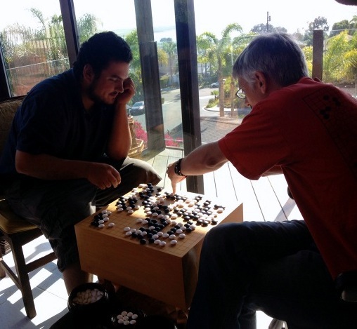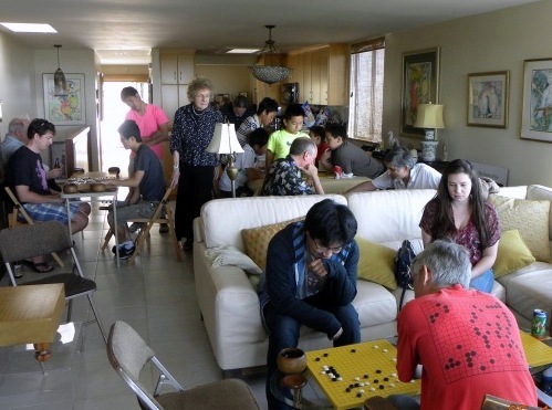 A record number of players turned out for the San Diego Go Club’s 2014 Spring Go Soiree on Saturday, May 17. Over 30 players, aged 7 to 70+ attended the all-day informal event at chapter president Ted Terpstra’s home. Tony Koslow 16k walked off with the $50 first-place prize for most number of AGA-rated wins, while David Baran, who traveled down from Beverly Hills, took second place. There was spirited action from a group of 3-dan players from the club and the UCSD club. After the games, people were treated to a burgers and chips dinner as analysis carried on into the evening. - photos courtesy Jenna Jansen