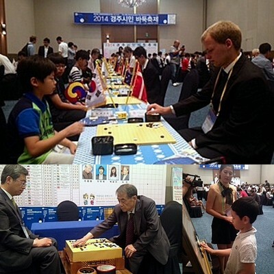 The 35th World Amateur Go Championship got underway Saturday morning in Gyeongju, Korea with the traditional Friendship Match between local go players and the WAGC players from around the world. Gathered in the main playing area on the first floor of the Hotel Hyundai, the WAGC players' places were marked as usual by their nation’s flags and the locals eagerly joined them for a spirited round of friendly but intense matches. At the head of the room were pro Kim In 9P (at right in photo at lower left) playing a teaching game with a local luminary beneath the WAGC banner. Gyeongju City, along with the Republic of Korea, is hosting the WAGC in this scenic resort in the Bomun Lake resort area. In the back of the room, professional Hyun Wook Lee (at right in bottom right photo) played a 10-on-1 simul while Ms. Yun Jin Bae gave some three dozen avid youngsters a go lecture. After an opening ceremony and banquet on Saturday night, the tournament will begin Sunday and run through Wednesday, with games scheduled each morning and afternoon. The E-Journal and Ranka are teaming up again this year to provide full coverage of the WAGC, including updates on each round, player interviews, game commentaries, photos and final daily results at the end of each day. - report/photos by Chris Garlock