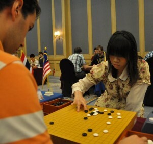 gave Chan a winning position, although fierce and complicated play continued for another 200+ moves. Japan’s Kiko Emura, hoping for victory after a disappointing 8th place in last year’s tournament, also lost a half-pointer to China’s Ruoran Wang; their 3rd-round battle kept fans on the edge of their seats as the two players tussled over an intense endgame in which Emura was constantly under time pressure. As it turned out, the pressure extended to Emura’s clock button, which finally broke, allowing Emura’s time to expire, and bringing play to a halt as a crowd gathered around the board awaiting the referees’ decision as to how to continue the game. It was decided to keep playing with a new clock, giving the Japanese player one final byo-yomi period. “I was happy with how things were going,” said Emura, “but before I knew it I wound up half a point behind. I’m used to fast time limits