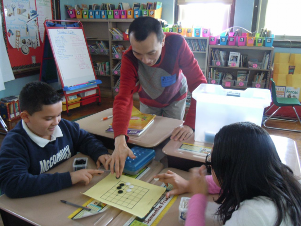Students at McCormick Elementary, in Chicago, IL, had the opportunity recently to learn to play go from Xinming Simon Guo 2d, a licensed math teacher and founder of the GoAndMath Academy. "Students were playing a simple game during the class, blissfully unaware that they were also working on math skills as they put every stone on the board and counted the result at the end of the game,” Guo told the E-Journal. At McCormick, the go class is part of the Chinese Artists-In-Residency Program, co-sponsored by Confucius Institute in Chicago (CIC) and GoAndMath Academy. The Chinese language teachers at McCormick -- where 99.5% of the students are hispanic and 50% are English Language Learners -- Ms. Yeh and Ms. Huang, heard about the go program during the professional workshop organized by CIC last year. "Go is an ideal tool to achieve the goal of our Chinese curriculum--to enhance students' understanding of Chinese culture, and reinforce their learning of language skills,” says Guo. “During the entire 2013-2014 school year, the go program offered more than 130 learning sections to more than 4500 students in Chicago public schools,” said Jane Lu, the director of CIC and coordinator of CPS Chinese World Language Program. "Go is not just a simple game,” says Guo. "Research by GoAndMath Academy reveals that there exists a hidden natural connection between math and go. Students can experience math concepts without even noticing them. More specifically, go helps students develop number sense, and three domains in Common Core standards: Counting and Cardinality; Operations and Algebraic Thinking; and Number and Operations in Base Ten. GoAndMath Academy designed the educational go program, which is appropriate for Pre-K through eighth grade, is aligned with the common core standards, and can be played with peers in school or around the world. This fantastic game combines math, science, art, and competition, as well as ancient oriental philosophy and culture. Go requires the highest level of critical thinking. It cultivates the abilities of observing, reflecting, imagining, reasoning, innovating, and decision-making,” says Guo.