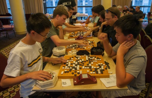 Keith Arnold to the 70 players assembled in the main playing area of the US Go Congress for the popular annual speed go event. "In fact, the Pro Dinner has been scheduled for tonight specifically so that there's no chance the professionals will see us play like this." Arnold explained that while "it's permissible to try to win on time" -- each player has 10 minutes with no overtime -- "it's illegal" to play bogus moves, although he noted that the rule "isn't enforceable" and that anyone getting too caught up in the rules "is taking this way too seriously!" He rapidly assigned the players into tables of six divided by playing strength and stones proceeded to fly at great speed. After five rounds in just two hours, 13 players emerged victorious as table winners. Several have already been table champions in the 9x9 and the 13x13. Dan table winners are: Zheng Xiangnan 7D, Xinying Jiang 6D, Will Lockhart 5D, Daniel Liu 5D, Cherry Shen 5D, Amy Wang 3D, and Eric Yang 1D. Kyu table winners are: Ben Peng 1k, Yukino Takehara 1k, Jim Fienup 3k, Jeff Wu 5k, Joe Suzuki 7k, Sean Davis 10k, and Kevin Wu 12k. Zheng Xiangnan, Ben Peng, and Jim Fienup are also table winners in the 9x9, and Jeff Wu is also a table winner in the 13x13.