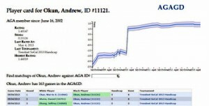 includes every game record in the AGA database, more than 130,000 since 1991. You can search by player or tournament. Player info includes complete tournament history, who you’ve played over time, and detailed info about your rating with a history graph of your progress; the blue line is your rating, the light blue on either side is your sigma (or variance in your rating).