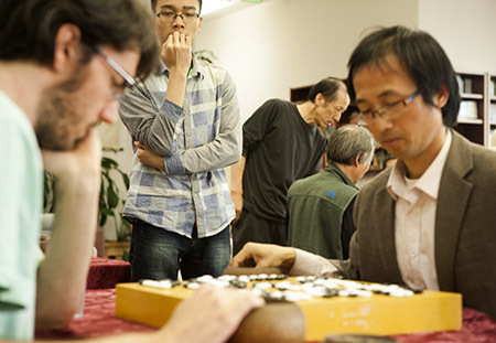 Peter Nelson, a recent arrival to Seattle from Minnesota, was selected for the Seattle 1 Pandanet-AGA City League Team, after winning the Qualifier Tournament at the Seattle Go Center by a narrow margin. Longtime Northwest player Edward Kim placed second at the tournament, with the same win/loss record, and will also join the team. Returning first team members are Simon (Ximeng) Yu, and Ho Son. The Seattle Pandanet-AGA team placed second last August in the A League competition, losing to the team from neighboring Vancouver B.C. The board order for the teams in the online tournament is determined by AGA ratings, so Nelson will probably have the alternate position. Nelson had an AGA rating of 3 dan last month, and has a 4 dan rating at present. However, he won two even games against a 7 dan at the tournament, plus a game against Xiaowu Li, who is a 5 dan in China, so observers expect his rating to continue to improve. The open tournament was a challenge to both players and Tournament Directors Sonny Cho and Dennis Wheeler. Due to "circular wins" four players had identical records after four rounds, necessitating a playoff round. The tournament lasted 9 hours and some players had five games. In addition to Peter Nelson and Edward Kim, Dong Baek Kim and Xiaowu Li were finalists. This was the first Seattle event for Xiaowu Li, a Visiting Scholar at the University of Washington Law School, and former director of the faculty go club at Tsinghua University, Beijing, China. Photo: Simon (Ximeng) Yu watches the game of Peter Nelson and Xiaowu Li. Report/photo by Brian Allen