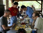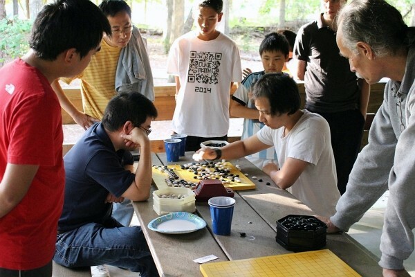 A glorious fall day at the Umstead State Park in Cary, North Carolina welcomed the 14th annual Triangle Memorial Go Tournament on September 20. Despite the tranquil surroundings, mental chaos reigned under the picnic shelter as 34 contestants from four states battled through four rounds. The early prediction for a final repeating last year’s showdown between the two 7-dan prior champions, but all expectations changed when the top three players all fell in the first round. Ultimately Seth Cardew (at right, in white shirt) of Tennessee, entered as 2-dan, emerged as the Open champion with a perfect score of 4-0, defeating both 7-dans in the process, including an astonishing kill against many-time champion Changlong Wu in the final round (right), taking just two stones, which secured the $500 top prize.