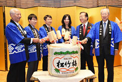 Yuta (on his right) and other worthies cracking over a wood barrel of sake with mallets. This is a custom on auspicious occasions, on achieving landmarks etc. and especially at the New Year. They will drink some of the sake with square wooden cups.