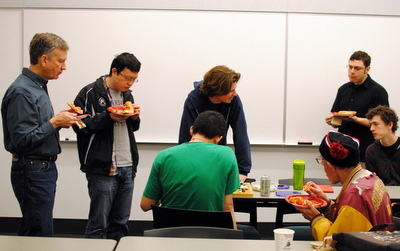 photo: Onlookers enjoy their pizza, courtesy of the AGA, while Peter Hansmeier (4d) and Yanqing Sun (2d) (at left) review their game.