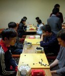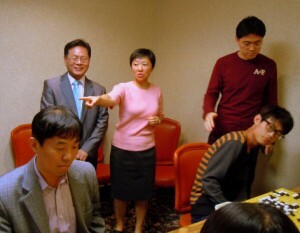 photo: Kwon Kapyong 8p, Feng Yun 9p, and Joseph Shun are standing; Kim Dae Yol and one of Mr. Kwon's stronger students are seated in the foreground.Click here to see
