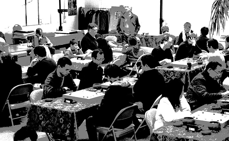 Since the Jan. 4 tournament had only three rounds, there was a tie for first place between Boyang Chen 6d from Oregon, and Chan Chung 5d from the Seattle area. Edward Kim placed 3rd, after losing one game on time. Go Center members were intrigued to meet the teacher of Edward Kim 7d, since Edward has taught many of the strong players in the Northwest. Years ago, Edward's teacher was his older brother Hong Kim, who also lives in the Seattle area. This was the first time Hong played in an AGA rated tournament. He won the handicapped section for players 2 kyu and stronger, playing as a 2d. Second place went to young Chanseok Oh. The 3 kyu to 9 kyu band was won by local Frank Brown, with new player Ben Resnick placing second. The double digit kyu player's section was won by Elan Ma, with second to California visitor Barry Stiefel. Elan also won the children's prize. There were 30 players at the tournament, which is held on the first Sunday in January every year to mark the birthday of our old friend Jin Chen. Report and photo illustration by Brian Allen
