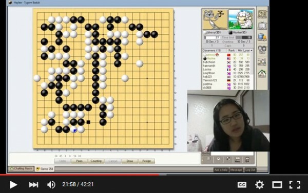 opponents are debating their fate in another room, probably also recorded. We’ll edit the two videos together later to put on YouTube.” This year’s Congress runs August 1-9 in St Paul, MN. In her videos, Hajin records as she plays a random player on Tygem, explaining her moves and thinking as she goes along. In Haylee’s gentle but disciplined playing style, games usually proceed rather quietly until her opponent -- generally a very strong player -- makes a modest mistake and their game disintegrates like an airplane whose rivets turn out to have been made of putty. Lee, a frequent Go Congress attendee,