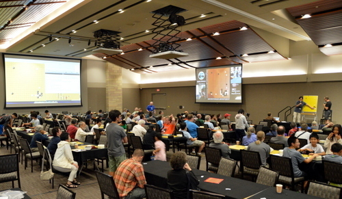 photo: Friday night's live US Masters Open pro commentary by Myungwan Kim 9P (at board) with E-Journal Managing Editor Chris Garlock; Yilun Yang 7P also provided commentary. photo by Steve Colburn