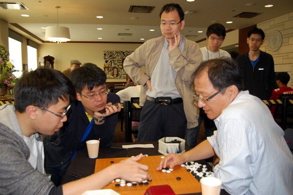 photo: Tong (second from left) reviews the Round 9, Board 2 game with Chen Wang 7D and Qun Wang 8P, as Yongfe Ge 7D, Ryan Li 1P and Eric Lui 7D watch; photo by Chris Garlock