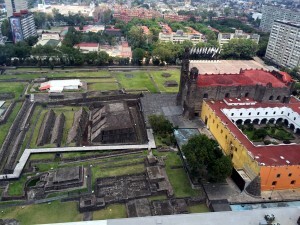 is also a very strong player, who placed sixth in the recent Prime Minister's Cup. Saturdays's two rounds were followed by a lecture from Myungwan Kim 9p on a game he played with Lee Sedol that was a watershed event in his go playing career. Kim then played a simultaneous match with 12 local players. The photo at right, the view from board #8 in the tournament room, shows the ruins of Tlatelolco, a former pyramid transformed into an adjacent church by the Spaniards.
