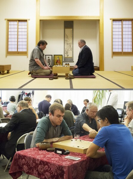 Photo Captions: (Top) Andy Okun, President of the AGA, playing Harry van der Krogt of the European Go Cultural Center in a friendly game in the tatami room of the Seattle Go Center. (Bottom) First round of the tournament. Photos and report by Brian Allen.