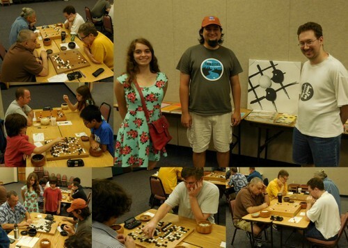 Photos by Bart Lipofsky; collage by Chris Garlock (top right) Winners Heather Crawford 13K (left); Aaron Otero 8K (center) & Jonathan Fisher 4D (right); (bottom right) Front left - Dan Micsa 4D Front right - Jonathan Fisher 4D, Back left - Steve Barberi 1K Back right, hidden behind Fisher - Karsten Henckell 4D; (middle bottom) Paul Wiegand 6K, Orlando TD (bottom left): 3 Crawfords: Front left at table - Eric Crawford 8K Front right at table - Aaron Otero 8K, Back left, standing - Heather Crawford 13K Back right, standing - Eddie Crawford 26K (middle left): 3 youngest: Front left - Eddie Crawford 26K, Front right - Yuliang Huang 15K, Back left - Kevin van Workum (the older player) 10K Back right - Heather Crawford 13K (top left): Front left - Dan Micsa 4D Front right - Steve Barberi 1K, Back left - Karsten Henckell 4D Back right - Jonathan Fisher 4D