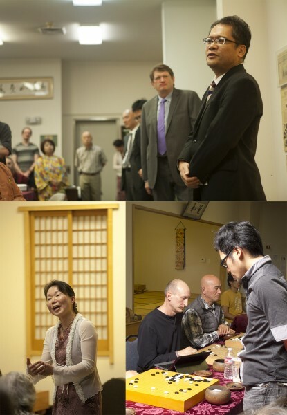 Photos: (top) Hiroshi Yamashiro 9P giving greetings from the Nihon Ki-in, (left) Fumi Tagata soprano, (right) Kuma-sensei playing simultaneous games.