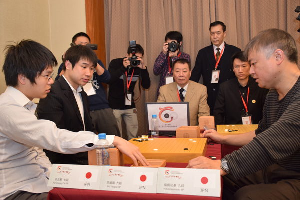 Korea wins team tournament: The Golden Dragon City Cup World Team Championship is an unusual team tournament that includes consultation games. It started out two years ago as the Zhugang Cup, but in its second term changed its name to the above. Three-player teams compete and in the first term, only the final was a consultation game; this time the semifinals were also consultation games. This year’s tournament was held in Guangzhou City from December 16 to 22. The semifinalists were the top teams in a five-round Swiss with 16 teams. These included nine teams that had won their way through the preliminaries and seven seeded teams from Japan, China, Korea, and Chinese Taipei. Another unusual feature of this tournament is that, besides their regular teams, Japan, China, and Korea also fielded ‘wild card teams’, made up of players over 29 who had won world titles or who had made outstanding contributions to go. The Japanese wild card team consisted of Cho Chikun, Kobayashi Koichi, and O Rissei, and the regular team of Yoda Norimoto 9P, So Yokoku 9P, and Yo Seiki 7P. In the Swiss System tournament, China took first place with five wins; its team was made up of its number one to three players, that is, Ke Jie, Shi Yue, and Zhou Ruiyang. Its record was 14-1, with only Zhou dropping a game. Second was Korea, third was Japan, and fourth the Korean wild card team. Just for the record, the 5th to 16th places were as follows: China wild card, Australia, Chinese Taipei, China Hong Kong, Japan wild card, Germany, Ukraine, Russia, Poland, France, Israel, and Singapore. In the semifinals, Korea beat Japan and China beat Korea wild card. In the final, Korea (white) beat China by half a point. In a play-off for third place, Korea wild card beat Japan.