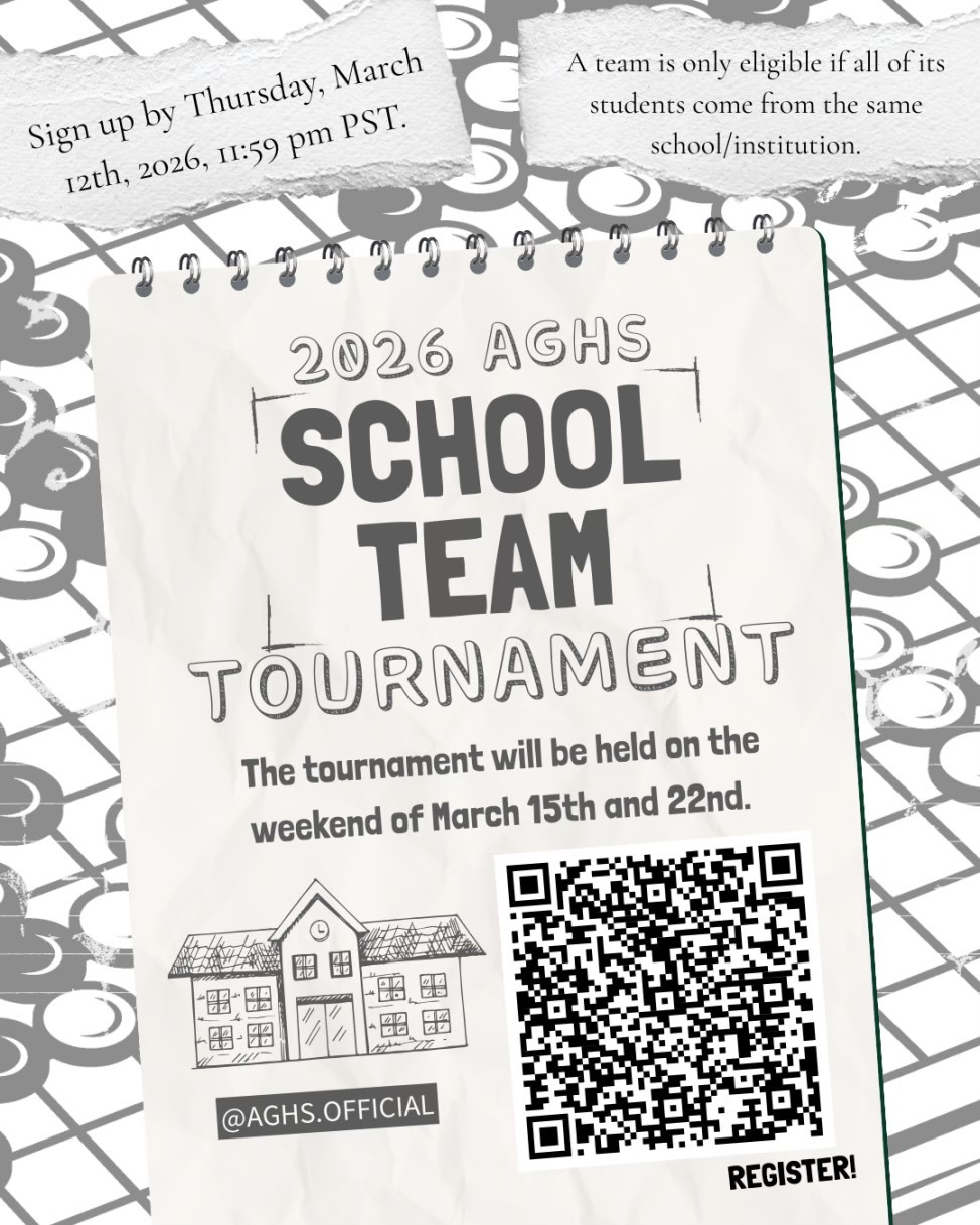 Continuing on, the AGHS will be hosting our 2026 School Team Tournament. All North American players under the age of 19 will be eligible, but must form a team of three (with one substitute player) to participate. The tournament will be split up into four rounds, with two taking place on March 15th, and the other two taking place on March 22nd. Register using this form by March 12th, 2026, at 11:59 PM PST. Please take a look at the rules & regulations document for further details.