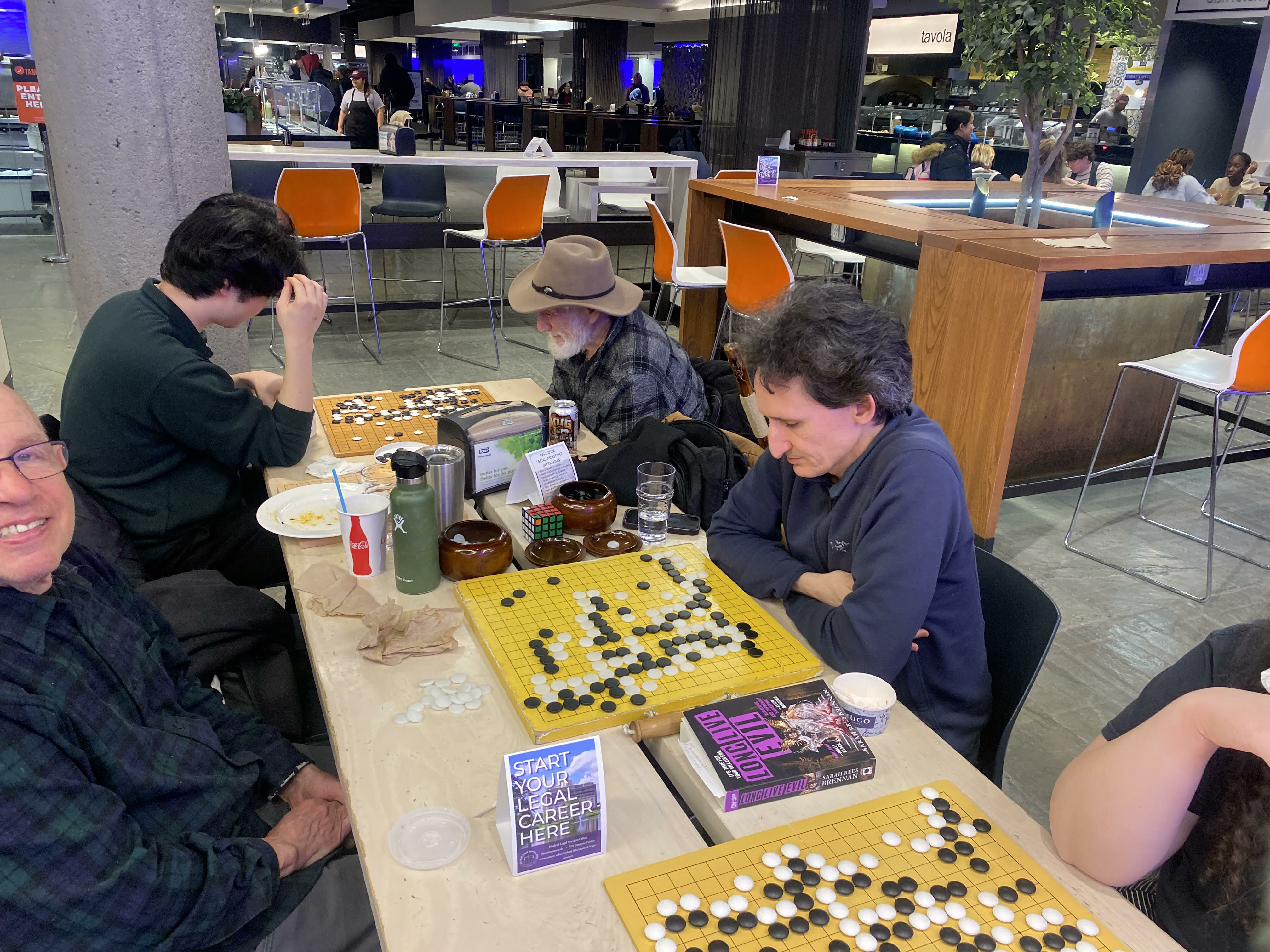had before," reports Eric Osman. "I sometimes wonder if people got too used to playing online and not having to drive even 20 minutes to play go. However, we are happy to report that in the last several weeks, participation has been picking up. I truly believe the beauty of this deep game we call go is best experienced in person. This photo was taken from our meeting tonight (2/26). We meet every Thursday night at the blue wall food court area of UMass in Amherst, Massachusetts. If you are in town, please join us. We love both beginners and experienced players equally."