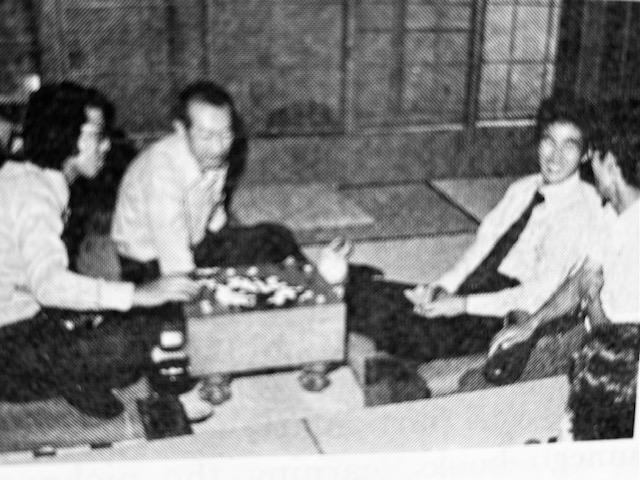 Ishida Meijin-Hon'inbō (right) and Ōtake (left) discussing a Meijin challenge game with Go Seigen (center).